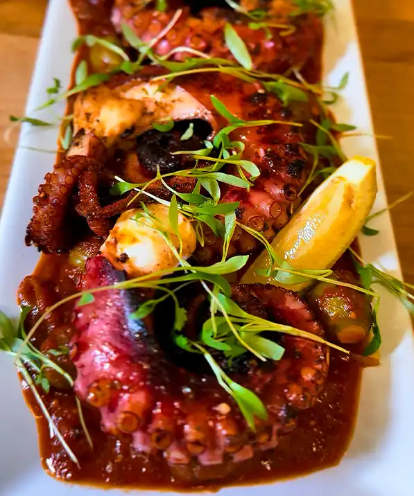 Tender octopus, expertly pan-seared to lock in flavor and finished with a delicate char, is the heart of this bold and soulful dish. Bathed in a house-made Creole sauce — rich with herbs, peppers, and slow-cooked aromatics — this plate is where spice meets elegance.